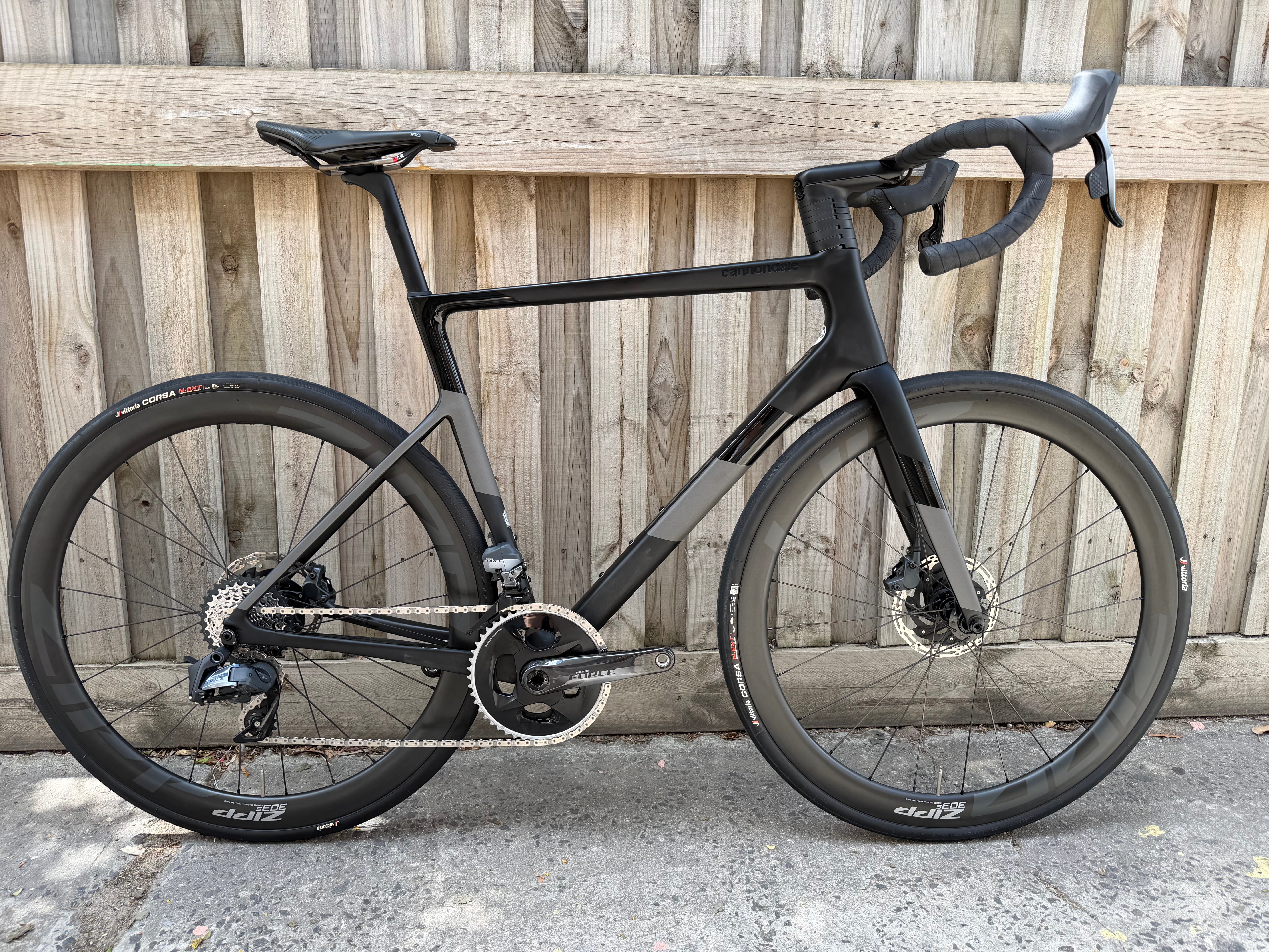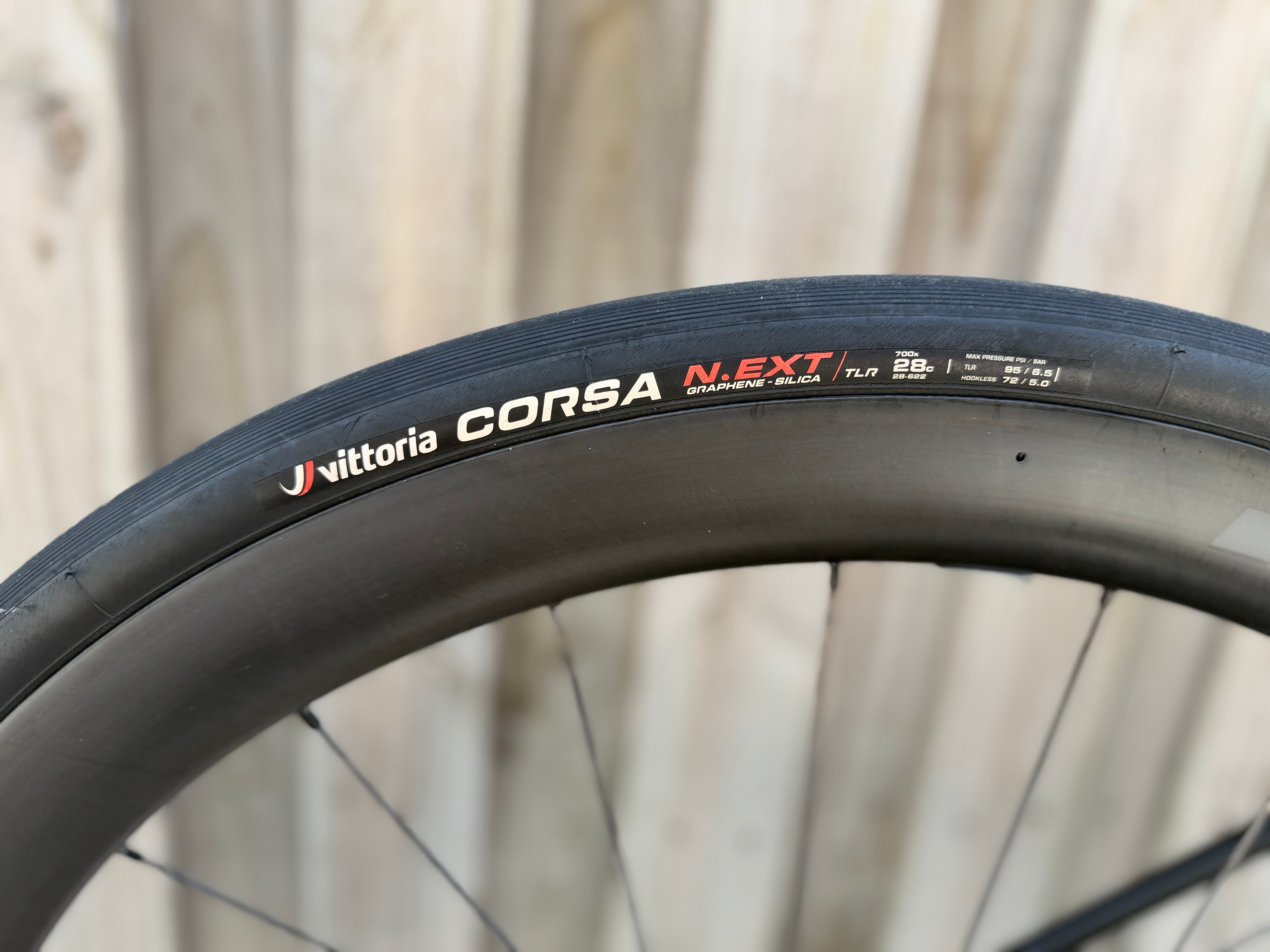 - Zipp 303S carbon wheelset with Corsa NEXT 28 rubber, set up tubeless